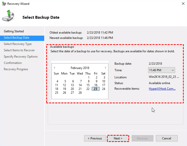 3. Sélectionnez la date et l’heure de la sauvegarde à utiliser pour la restauration, puis cliquez sur Next.