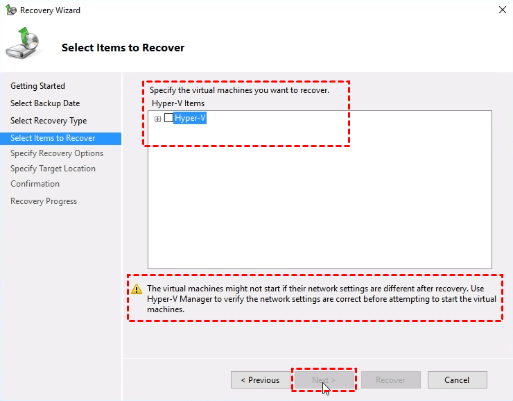 4. Sélectionnez l’option Hyper-V comme élément à restaurer.