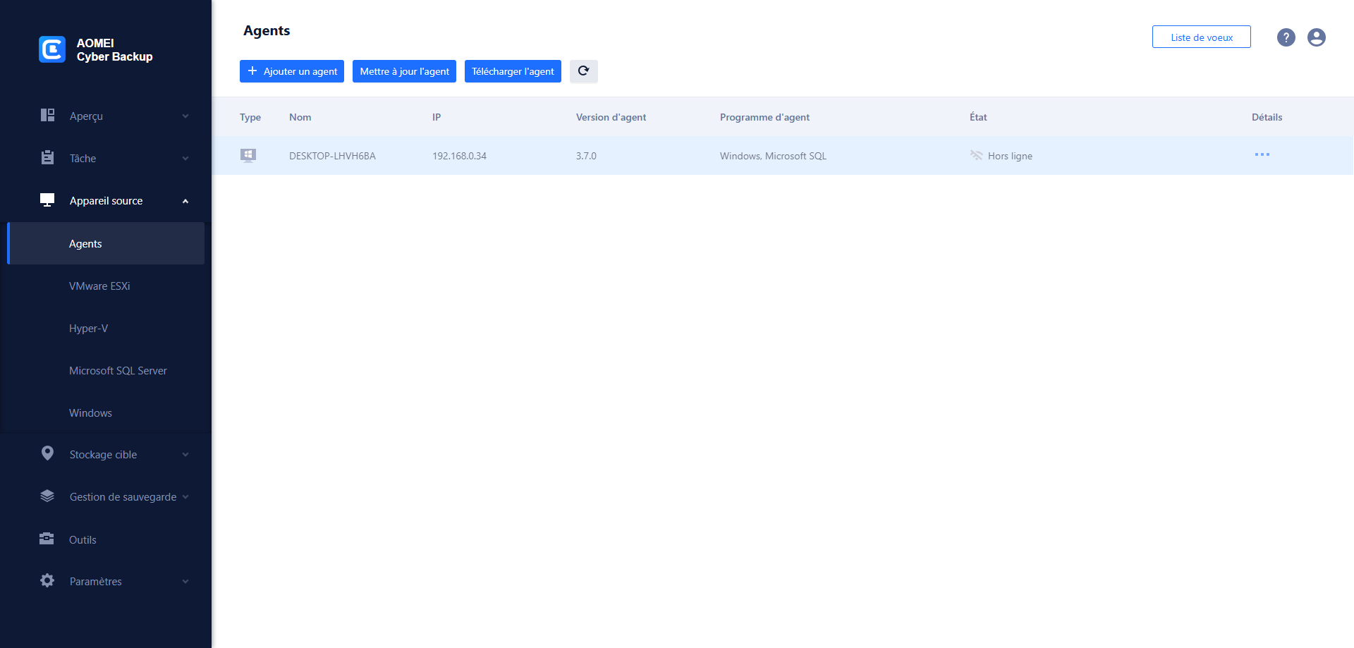 Étape 1. Cliquez sur Appareil source > Agents. Puis téléchargez et installez l’agent sur les machines à sauvegarder.
