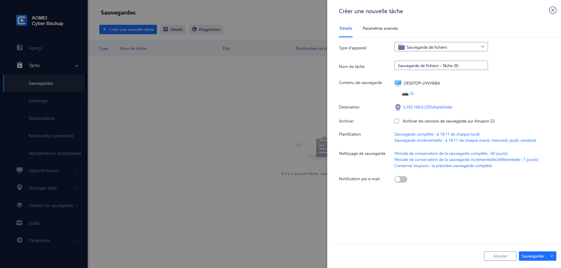 - Définissez le Nom de tâche, choisissez l'appareil dans Contenu de sauvegarde, Destination, Archive, la Planification, le Nettoyage et les notifications par e-mail selon vos besoins.