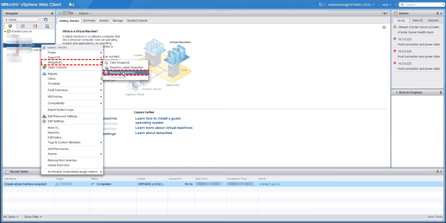 1. Accédez au client Web vSphere. Cliquez avec le bouton droit sur le nom de la VM et sélectionnez Manage Snapshots…