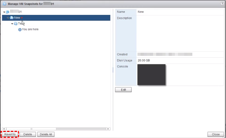 Sélectionnez le cliché instantané à restaurer dans le gestionnaire de clichés instantanés, puis cliquez sur Revert to.