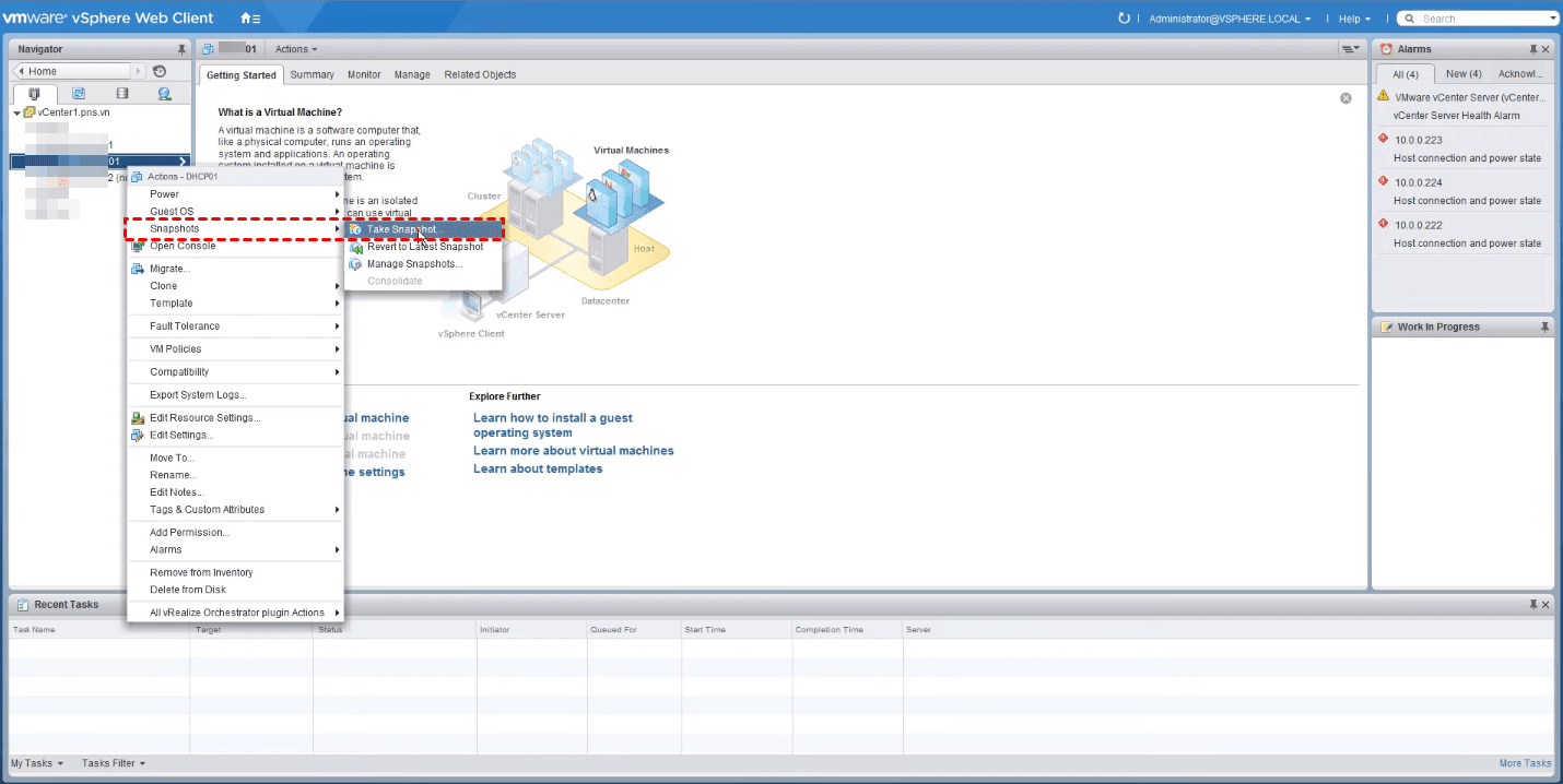 1. Accédez au client Web vSphere. Cliquez avec le bouton droit sur le VM name dans l’inventaire et sélectionnez Snapshots > Take Snapshot…