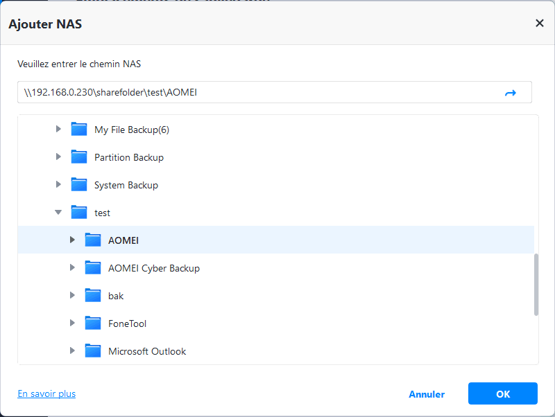5. Une fois le périphérique NAS ajouté, tous les dossiers partagés sur le réseau seront répertoriés. Choisissez un dossier comme chemin de destination pour l'image de sauvegarde, puis cliquez sur OK.