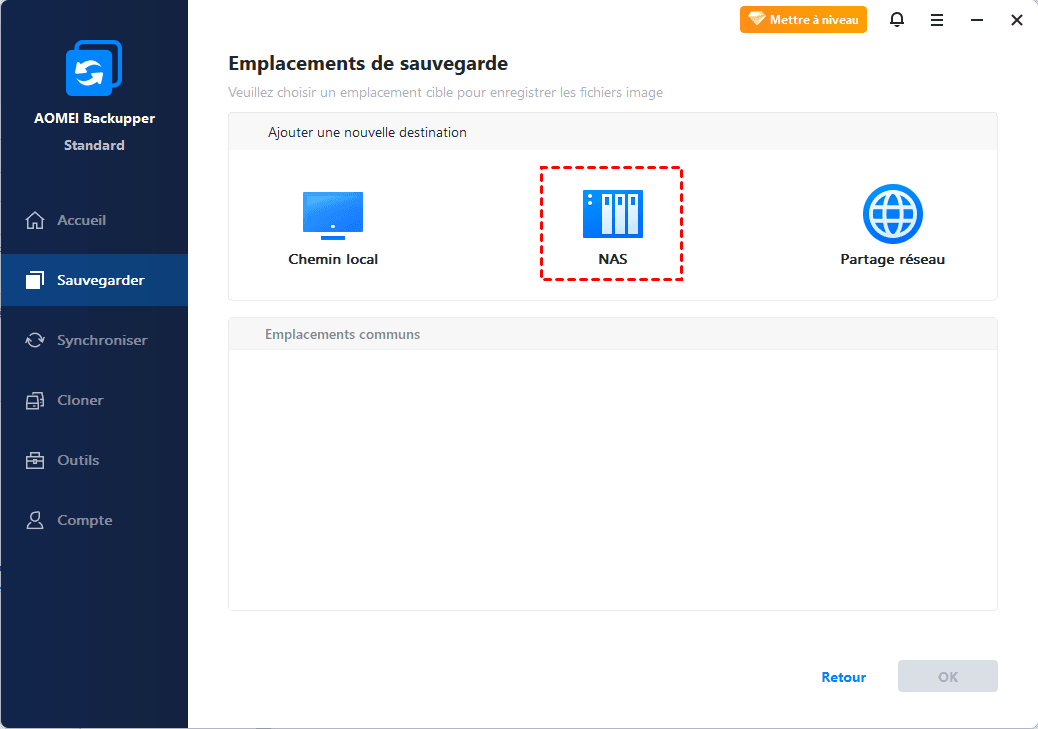 Le périphérique NAS (network attached storage) fournit à ses utilisateurs un grand confort. Tous les individus au sein d'une entreprise sont autorisés à partager leurs données dans le même temps en accédant aux périphériques NAS distants. Quant à la sauvegarde de données, vous pouvez aussi mettre le fichier Image de sauvegarde sur un périphérique NAS, au lieu de connecter manuellement l'ordinateur à un disque dur externe. Dans ce cas, il est nécessaire d'utiliser les logiciels spécialisés de Windows de sauvegarde pour sauvegarder sur NAS et pour restaurer à partir de NAS dans les Windows PCs et serveurs. Ici, nous allons voir ce logiciel gratuit de sauvegarde de Windows le plus récent - AOMEI Backupper.