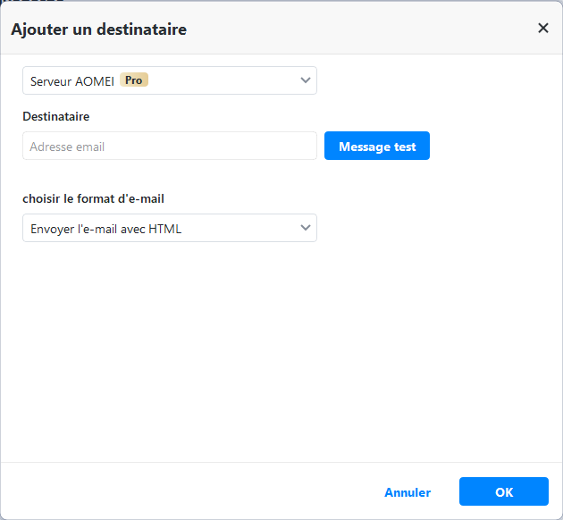 Pour vérifier si vos paramètres sont corrects ou non, AOMEI Backupper enverra un message de test à votre e-mail lorsque vous cliquerez sur « Message test ».