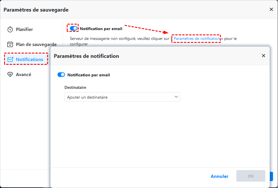 1. Activer la notification par e-mail lors de création d'une tâche de sauvegarde