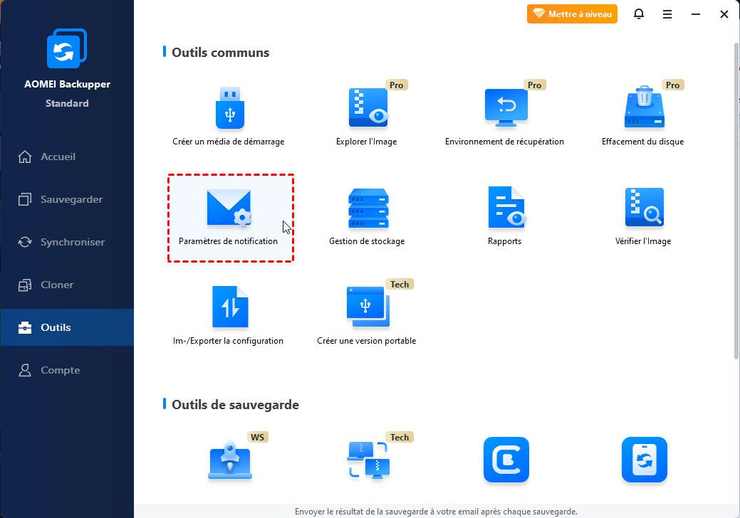 Ou, vous pouvez directement cliquer sur la barre Outils et sélectionner Paramètres de notification pour activer la notification par e-mail. Ainsi, lorsque vous créez une tâche de sauvegarde/synchronisation, vous pouvez simplement activer l'option « Notification par e-mail » sans avoir à configurer à nouveau les notifications.