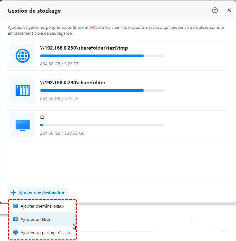 Avec l'outil Gestion du stockage, vous pouvez ajouter NAS à la liste de stockage à l'avance. Vous pouvez afficher, modifier ou gérer le NAS, et vous pouvez aussi sélectionner directement le NAS comme chemin de destination lors de la création d'une tâche.