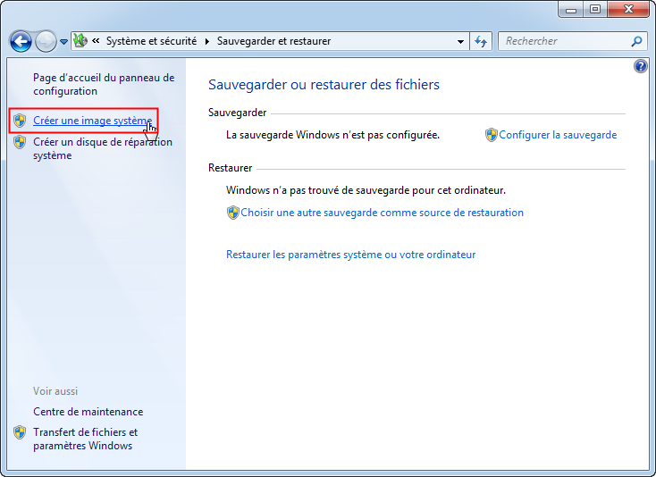 L'outil de sauvegarde intégré dans Windows peut aussi vous aider à créer une sauvegarde de système. On prend Windows 7 à titre d'exemple :