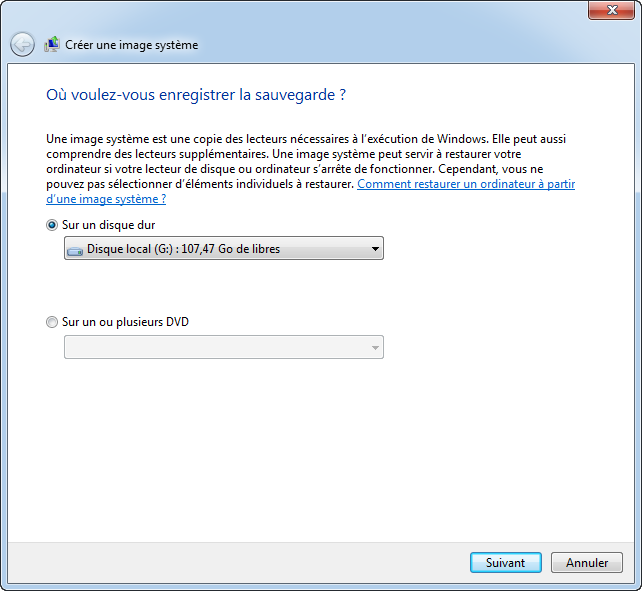 Sauvegarder le système sur un disque dur externe est un moyen efficace pour garder les données en sécurité. Vous pouvez restaurer votre ordinateur à l'aide de l'image systèmeorsque le système se bloque.