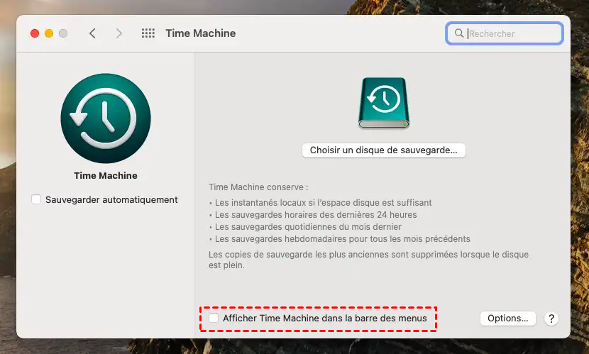 1. Accédez à Time Machine via le raccourci de la barre de menus. Si vous ne voyez pas cette option dans la barre de menus, cliquez sur Préférences Système > Time Machine, et sélectionnez Afficher Time Machine dans la barre de menus.