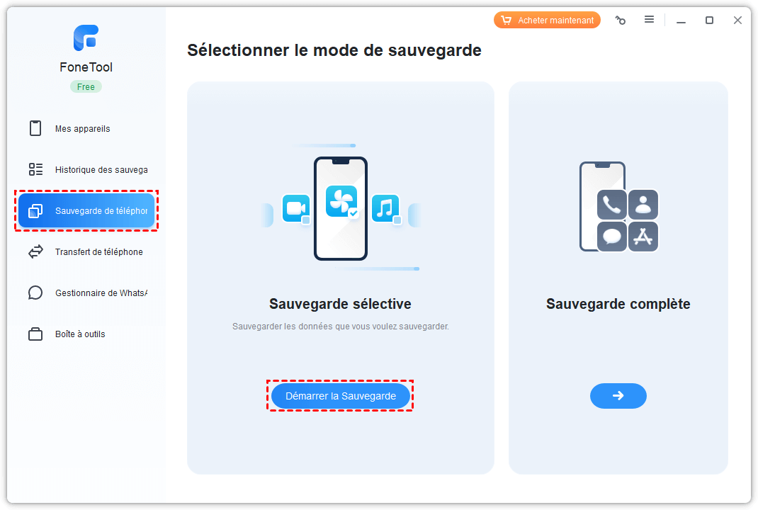 Étape 2. Sur l'interface de FoneBackup, cliquez sur Sauvegarde de téléphone > Choisissez Sauvegarde sélective ou Sauvegarde complète selon vos besoins > Cliquez sur Démarrer la sauvegarde. Ici, nous choisirons la sauvegarde sélective.