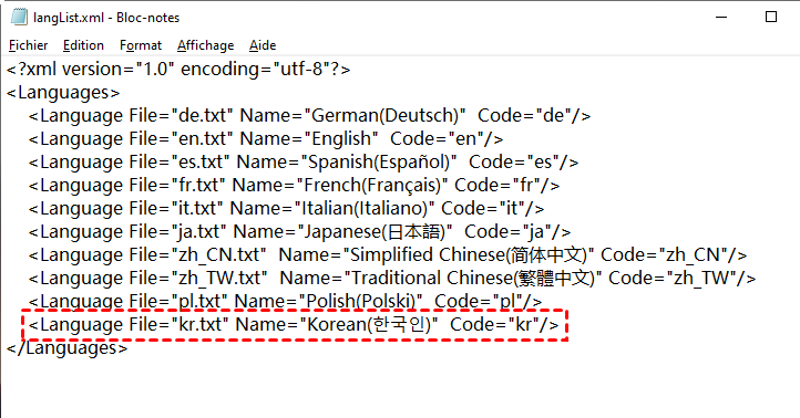 Remarque : Vous pouvez ajouter une langue personnalisée dans FoneTool. Pour ce faire, copiez d'abord le fichier de langue (par exemple kr.txt) dans le répertoire d'installation de FoneTool >lang (le chemin par défaut est "C:\Program Files (x86)\FoneTool\lang"). Ouvrez le fichier langList.xml par Bloc-notes, commencez une nouvelle ligne et saisissez le texte ci-dessous :