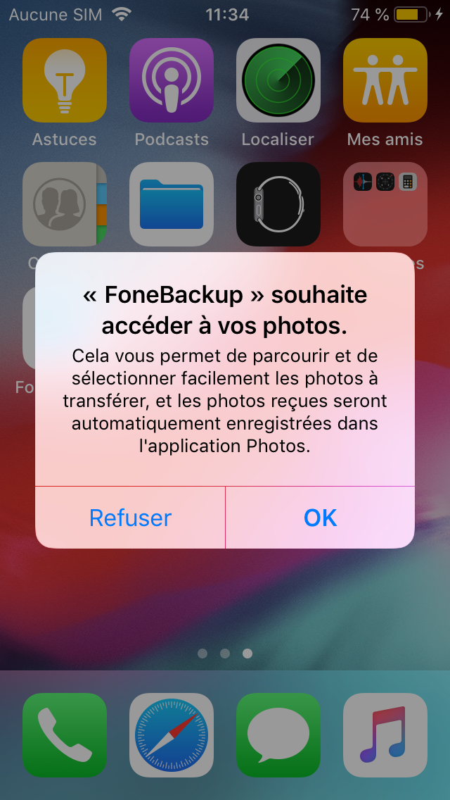 Étape 2 : Autorisez l'application FoneBackup iOS à accéder à votre réseau local, à vos Photos, à vos Contacts, à Apple Music et à votre bibliothèque multimédia.