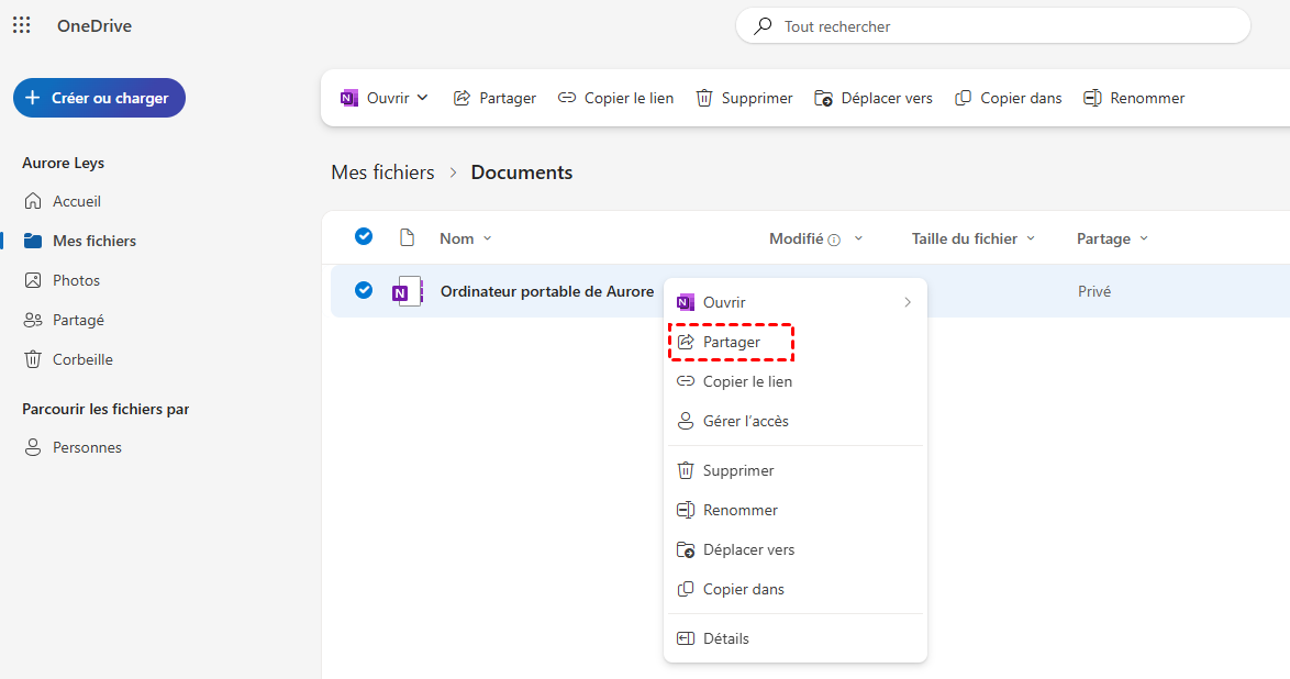 1. Accédez à votre compte OneDrive en ligne (via le site web). Trouvez le dossier partagé que vous ne voyez pas sur votre PC. Cliquez sur le dossier, puis sélectionnez Partager.