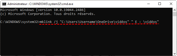 Pour synchroniser des vidéos sur OneDrive : en prenant « E:\vidéos » comme chemin complet du dossier source et « vidéos » comme nom de dossier, vous devez taper mklink /j "C:\Users\Username\OneDrive\vidéos" " E : \vidéos" et appuyez sur Enter.