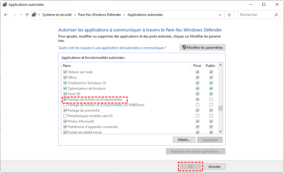 N'oubliez pas de vérifier que le pare-feu Windows ne bloque pas le partage de fichiers et d'imprimantes.