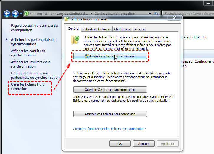 Pour synchroniser le dossier avec le Centre de synchronisation, la première chose à faire est d'activer les fichiers hors connexion. Si vous ne l'activez pas, vous ne pouvez pas utiliser le Centre de synchronisation.
