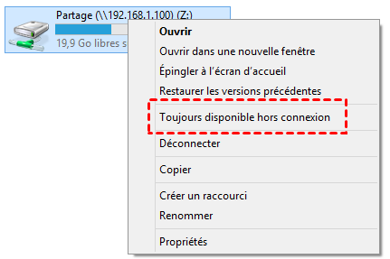 Étape 4. Une fois que votre ordinateur a démarré, accédez au lecteur réseau mappé, cliquez dessus avec le bouton droit de la souris et sélectionnez « Toujours disponible hors connexion » dans le menu contextuel. Si vous ne souhaitez pas déconnecter l'intégralité du lecteur réseau mappé, vous pouvez choisir des fichiers ou des dossiers spécifiques, cliquez dessus avec le bouton droit de la souris et sélectionnez « Toujours disponible hors connexion ».
