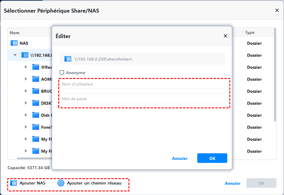 2. Ajoutez le NAS Synology et sélectionnez le dossier partagé dessus. Cliquez sur Ajouter un dossier > Share/NAS > Ajouter un partage ou des périphériques NAS, saisissez le chemin réseau (adresse IP du Synology NAS), le nom d'utilisateur, le mot de passe et cliquez sur OK.