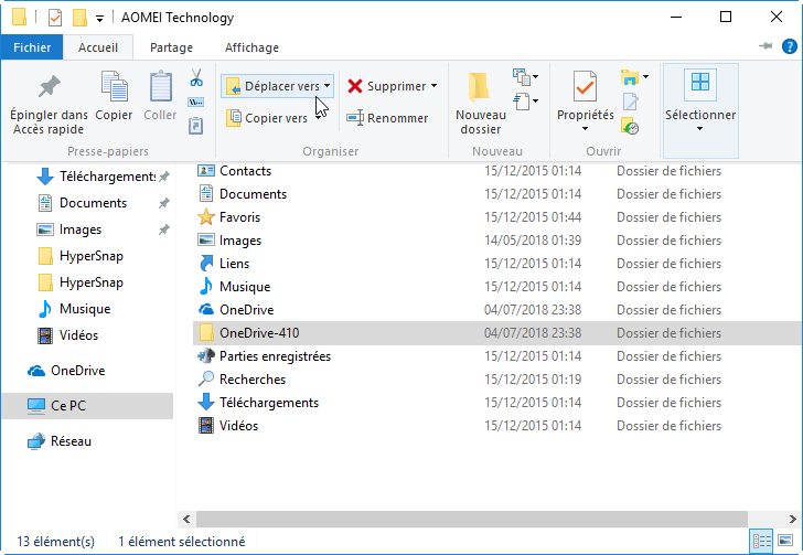 3. Ouvrez l'explorateur de fichiers et localisez votre dossier OneDrive. Puis cliquez sur le bouton Déplacer vers puis sélectionnez un dossier sur le disque dur externe.