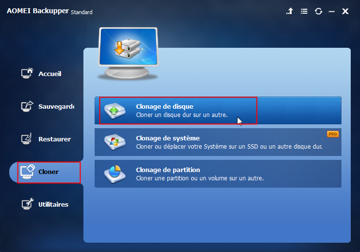 Étape 1. Installez et lancez AOMEI Backupper. Cliquez sur Cloner, puis sélectionnez Clonage de disque.