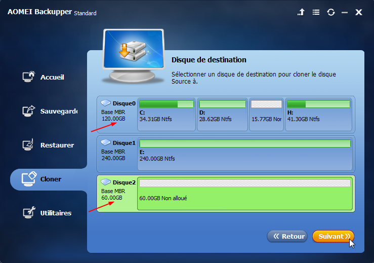 - Il vous permet de cloner directement un disque plus grand sur un disque plus petit tant que le disque plus petit peut contenir toutes les données du disque source.