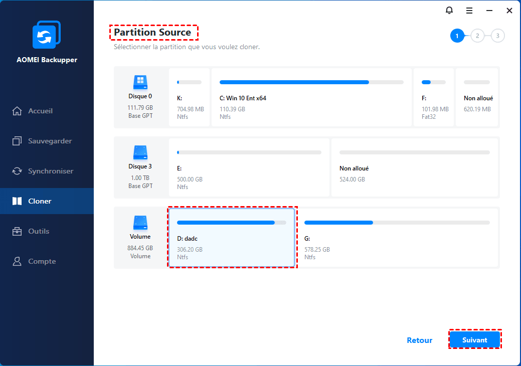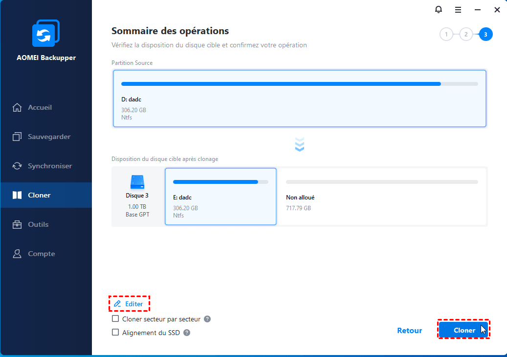 Attention : le disque de destination sera écrasé dans le processus de clonage, donc sauvegardez les fichiers sur le disque/la partition cible avant le clonage s'il y a des données importantes dessus.
