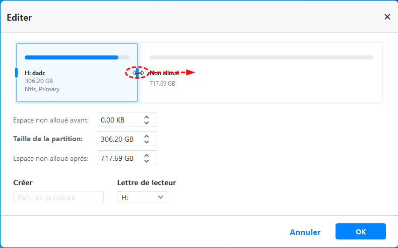 Étape 4. (Facultatif) Sur la page Sommaire des opérations, cliquez sur Éditer la partition, placez le pointeur de la souris sur la bordure de la partition de destination et faites glisser la bordure pour ajuster la taille de la partition. Vous pouvez également choisir le type de partition et modifier la lettre de lecteur pour la partition de destination ici.