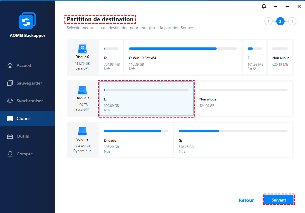 Étape 3. Sélectionnez la partition de destination pour stocker les données clonées et cliquez sur Suivant.