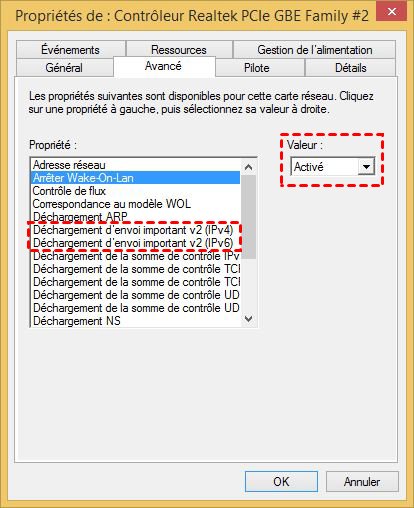 3. Passez à l'onglet Avancé, sélectionnez Déchargement d'envoi important (IPv4) et définissez la valeur sur Désactivé, il en va de même pour Déchargement d'envoi important (IPv6). Appuyez sur OK pour le confirmer.