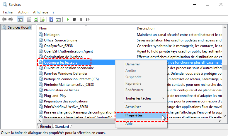 2. Recherchez Optimiser les lecteurs, cliquez dessus avec le bouton droit et choisissez Propriétés.