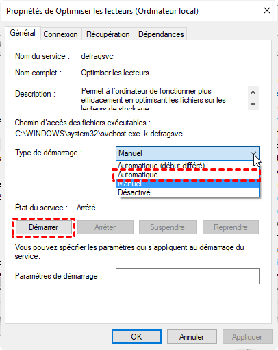 3. Changez le type de démarrage en Automatique et appuyez sur Démarrer sous État du service.