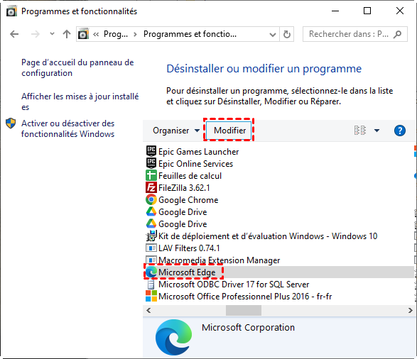 1. Accédez à Panneau de configuration > (Programmes) > Programmes et fonctionnalités, et recherchez Microsoft Internet Explorer/Microsoft Edge.