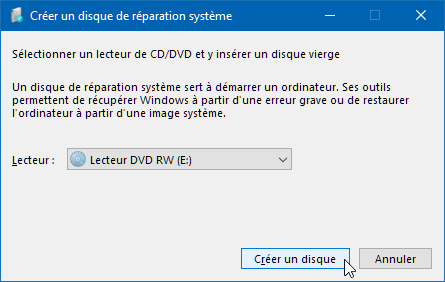 Pour créer un disque de réparation système Windows 10, il est nécessaire d'avoir un disque CD/DVD. Cependant, un lecteur de récupération peut être créé sur un lecteur USB et doit être supérieur à 16 Go.