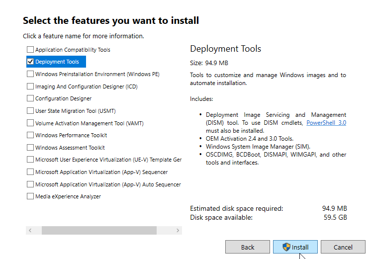 3. Téléchargez et installez le dernier Kit de déploiement et d'évaluation Windows (Windows ADK) pour Windows 10. Il vous suffit de sélectionner Outils de déploiement à installer.