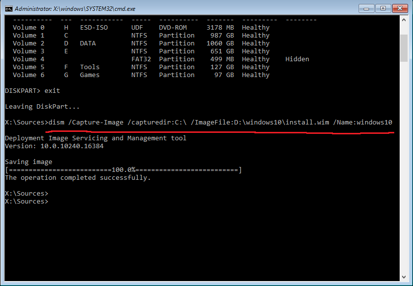 dism /Capture-Image /CaptureDir:C:\/ImageFile:D:\windows10\install.wim /Name:windows10 /description:2018-01-10