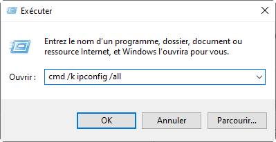 Utilisez la combinaison de touches Windows + R pour ouvrir la boîte de dialogue Exécuter, tapez « cmd /k ipconfig /all » et appuyez sur Enter pour exécuter cette commande.