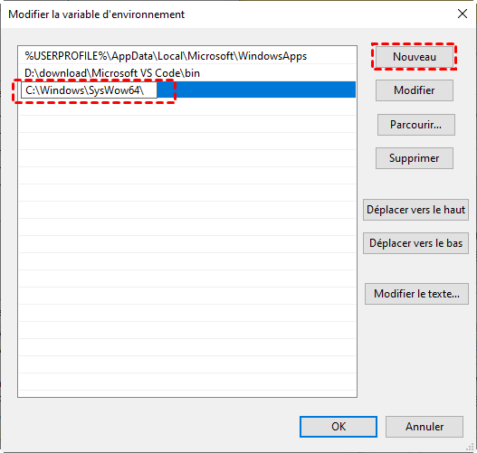 3. Cliquez sur le bouton Nouveau dans la barre latérale droite, ajoutez C:\Windows\SysWow64\ et cliquez sur OK pour enregistrer les modifications.
