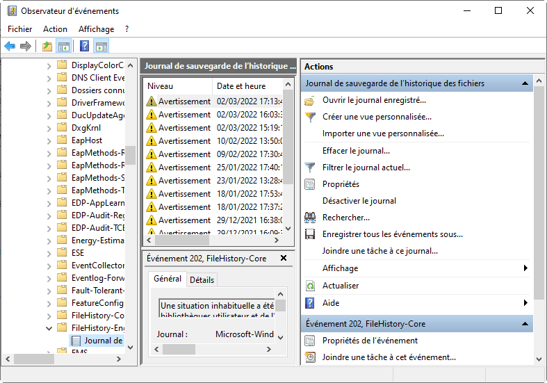 - Erreur 4 : l'Historique des fichiers a trouvé des fichiers chiffrés avec Encrypting File System, sur un emplacement réseau ou sur un lecteur qui n'utilise pas le système de fichiers NTFS, ces fichiers ne seront pas sauvegardés.
