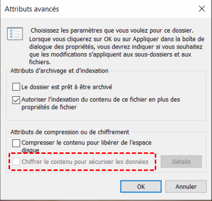 - Décochez l'option Chiffrer le contenu pour sécuriser les données, puis cliquez sur OK.