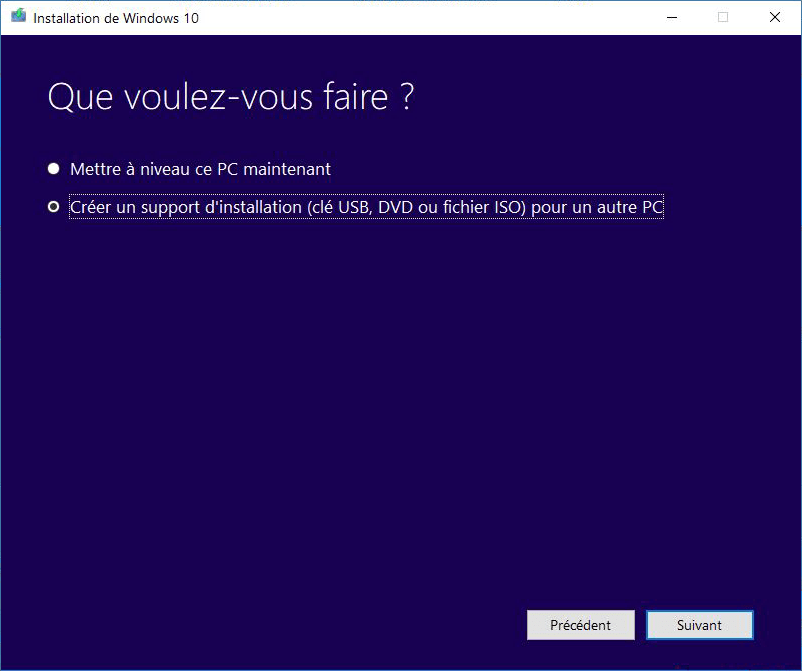 Étape 1. Vous devez d'abord télécharger l'outil de création de support, cela vous aidera à créer un nouveau package d'installation correct pour Windows 10 sur une clé USB ou un CD. Démarrez-le et sélectionnez l'option "Créer un support d'installation pour un autre PC" et suivez l'assistant pour créer un support d'installation.