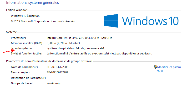 #1. Vérifiez si votre système Windows 10 est un système 64 bits : ☛☛ Accédez au Démarrer > Paramètres > Système > Informations Système > Type de système.
