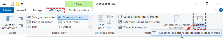 Étape 1. Accédez à Explorateur de fichiers > Affichage > Options > Modifier les options des dossier et de recherche.