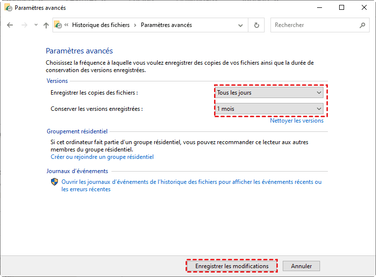 Comme mentionné précédemment, vous n'avez peut-être pas correctement configuré la sauvegarde de l'historique des fichiers, donc de ce point de vue, vous pouvez 1. modifier les paramètres avancés. En outre, vous pouvez 2. supprimer manuellement le dossier de l'historique des fichiers ou 3. réinitialiser l'historique des fichiers dans Windows 10 ou 11.