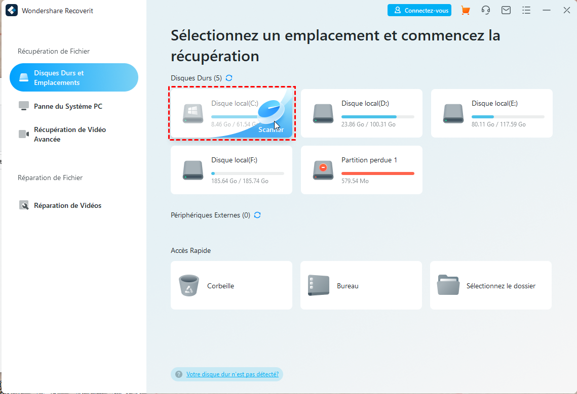 1. Installez et lancez Recoverit, le logiciel scannera automatiquement tous les lecteurs de votre PC.