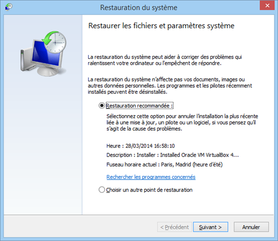 Cette commande vous mènera à l'interface de la restauration du système. Vous pouvez utiliser le point de restauration recommandé ou choisir un point de restauration. Puis cliquez sur Suivant. Suivez les instructions pour terminer la restauration du système.