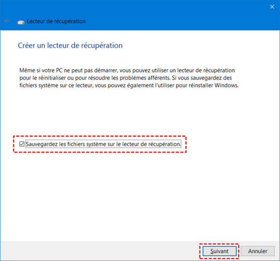 Étape 3. Cochez Sauvegardez les fichiers système sur le lecteur de récupération et cliquez sur Suivant. Si vous ne cochez pas cette option au cours du processus, Réinitialiser ce PC et Récupérer à partir d'un lecteur ne seront pas disponibles dans l'environnement de récupération du système.