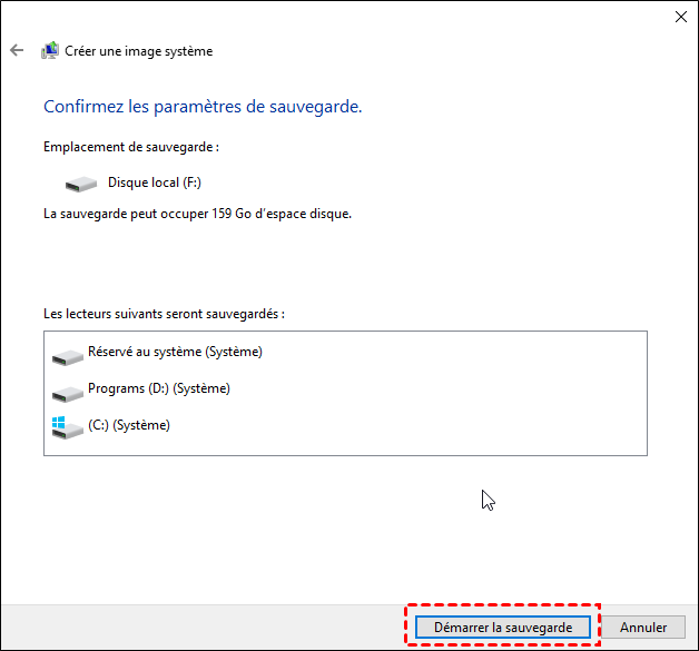 4. Confirmez les paramètres et appuyez sur Démarrer la sauvegarde pour créer une image système Windows 10.